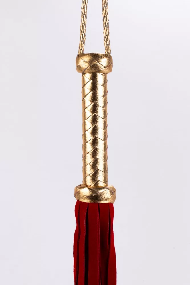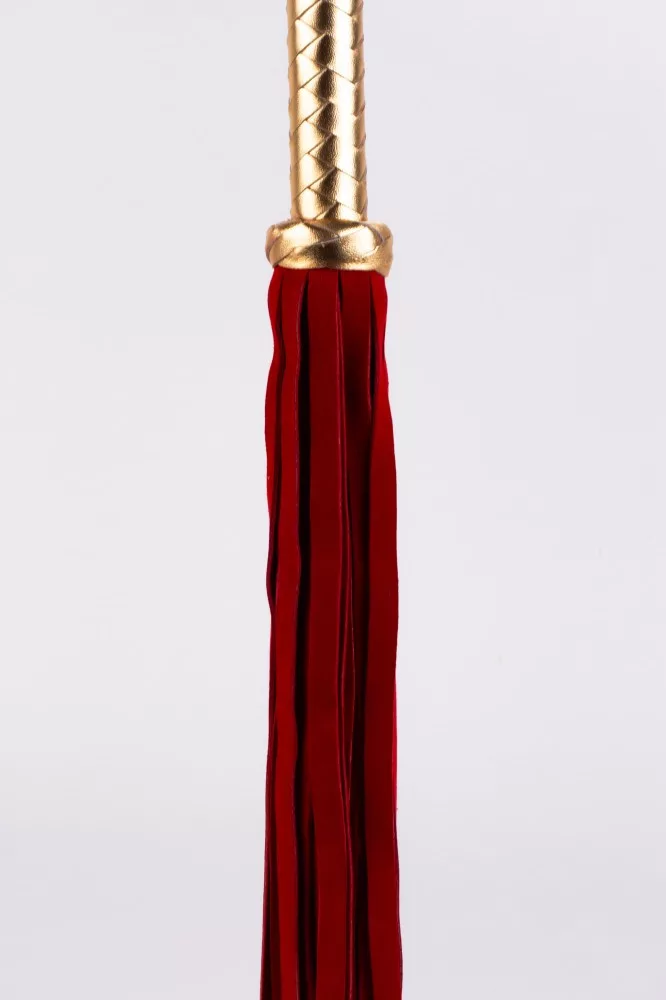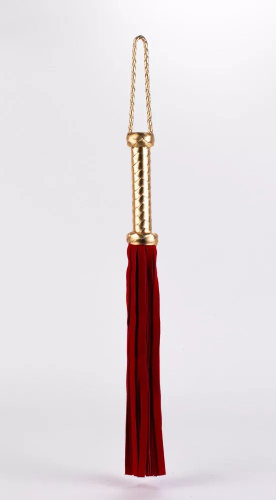 Flogger fém bőr fogantyúval és velúr bőr farokkal, piros, 45 cm