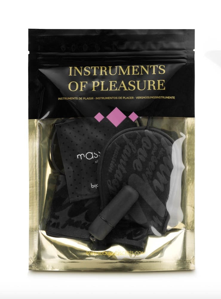 A szett tartalma egy minivibrátor, egy sikosító, egy szatén maszk és egy kötöző.