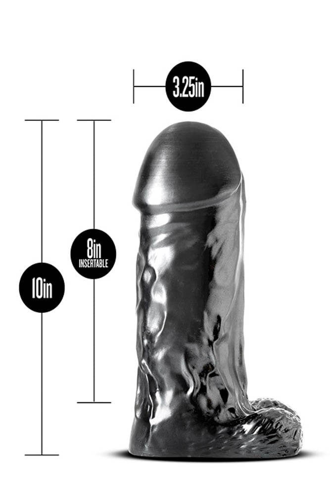 Hipoallergén, testszövethez hasonló, bőrszerű tapintású anyagból készült, motor nélküli, erezett felületű, herékkel kiegészített, fényes, nagy méretű dildó.